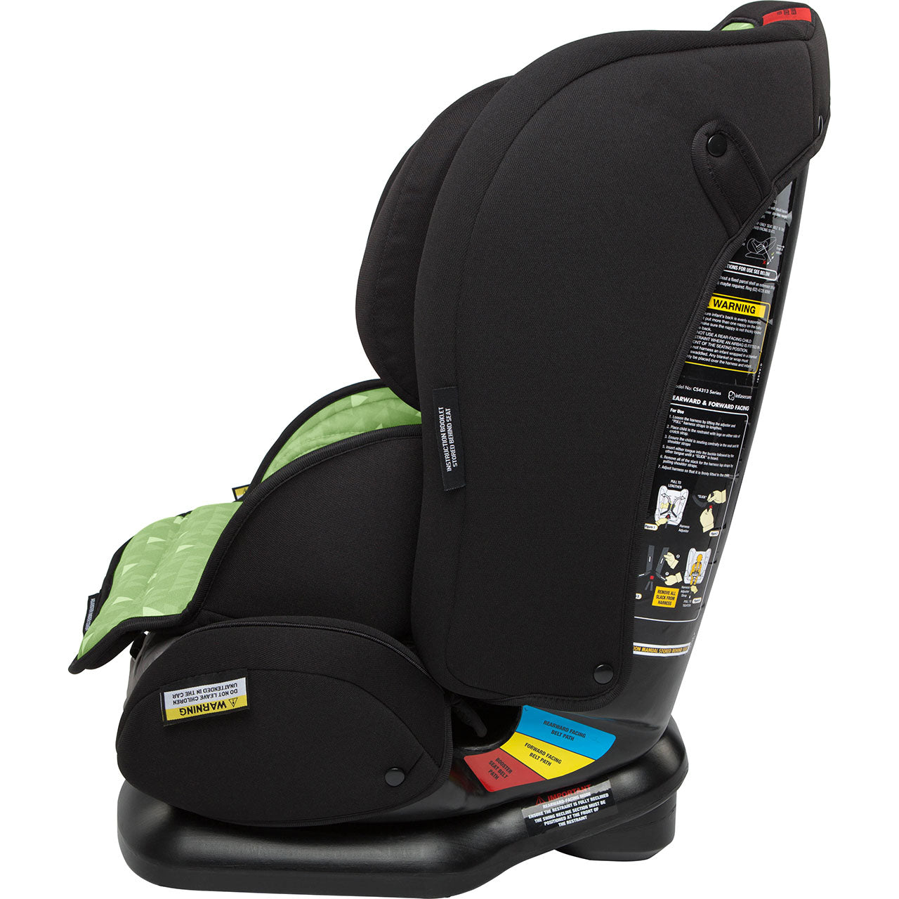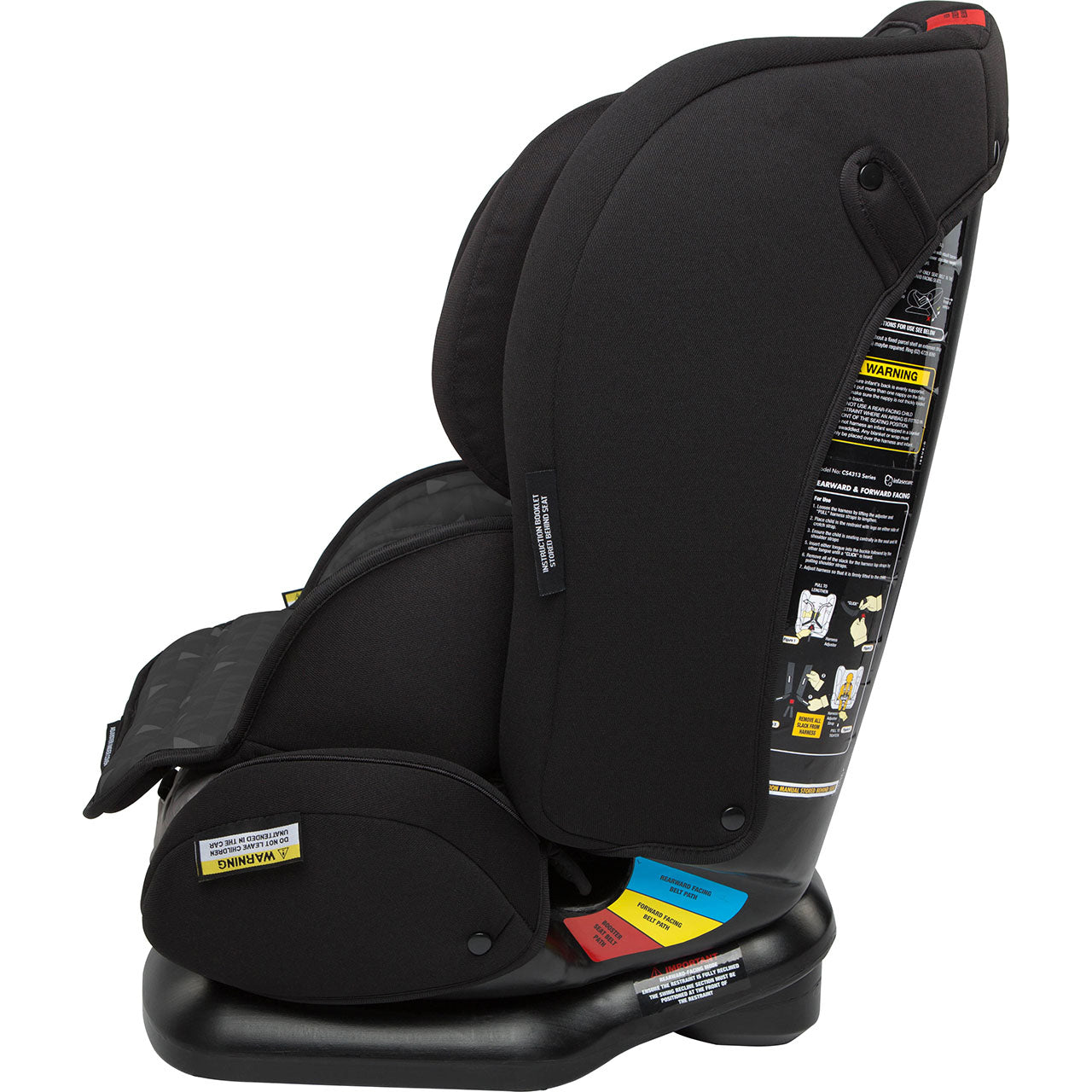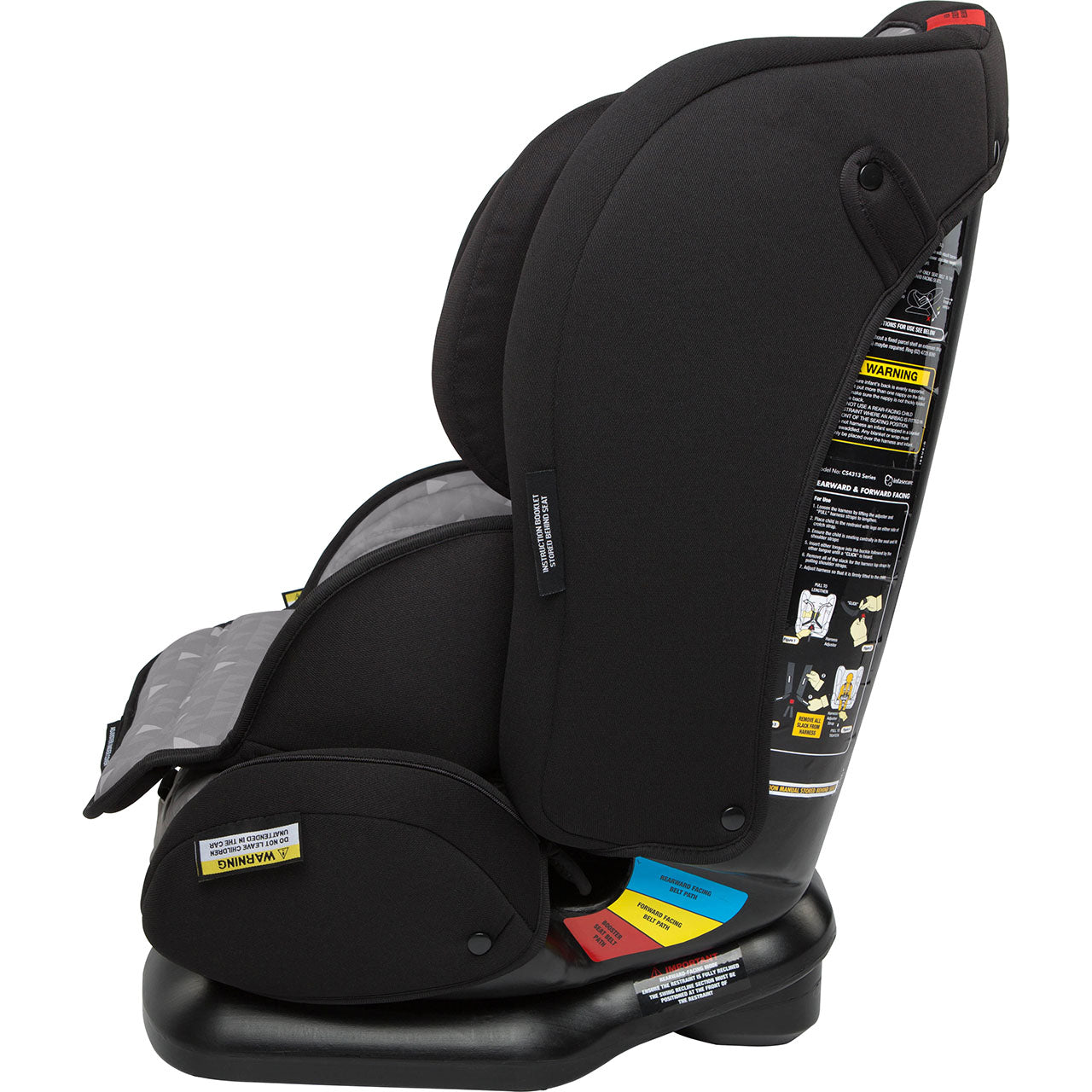 It has three modes of use – Rearward Facing, Forward Facing with an internal harness, and as a Booster Seat used with the vehicle’s lap & sash seatbelt.