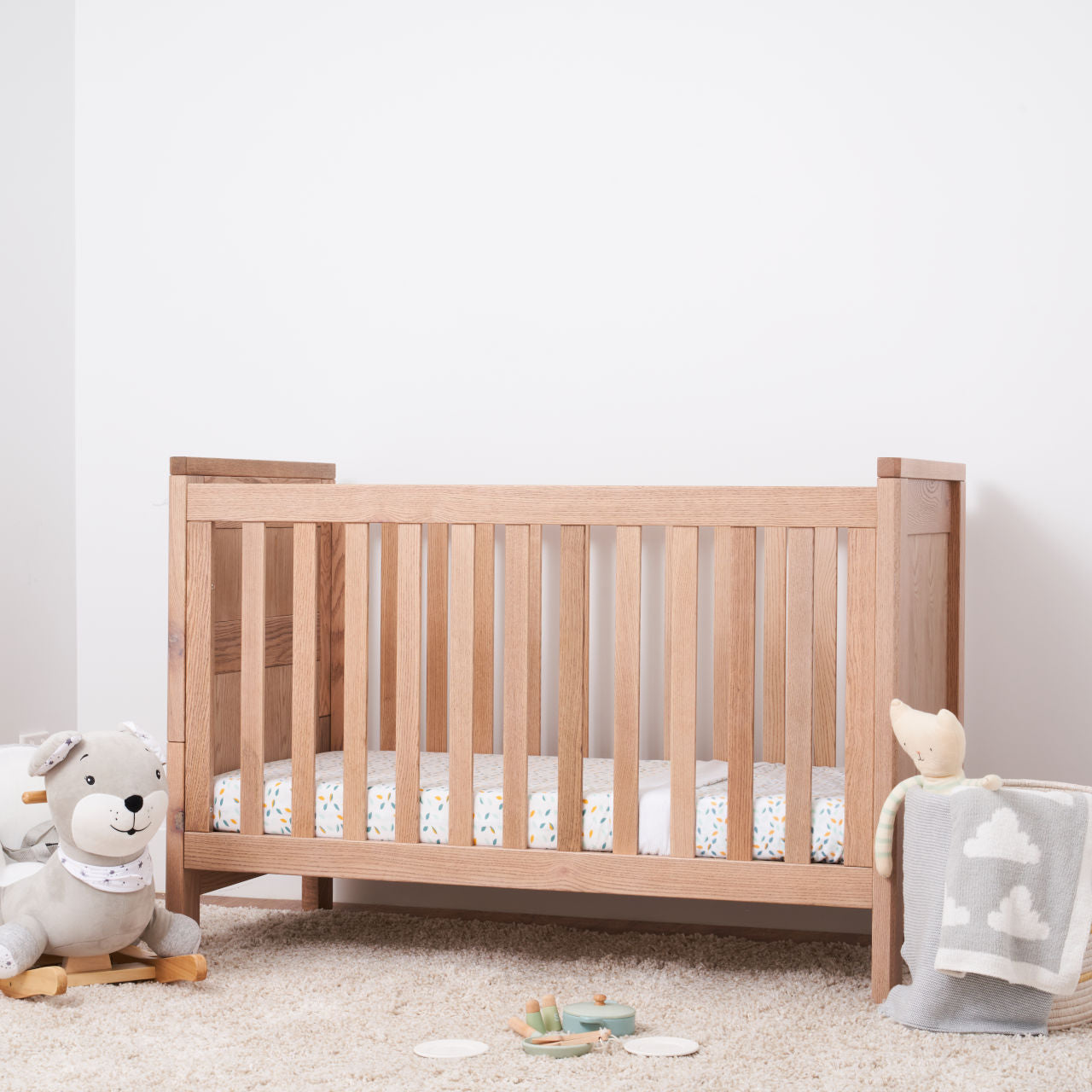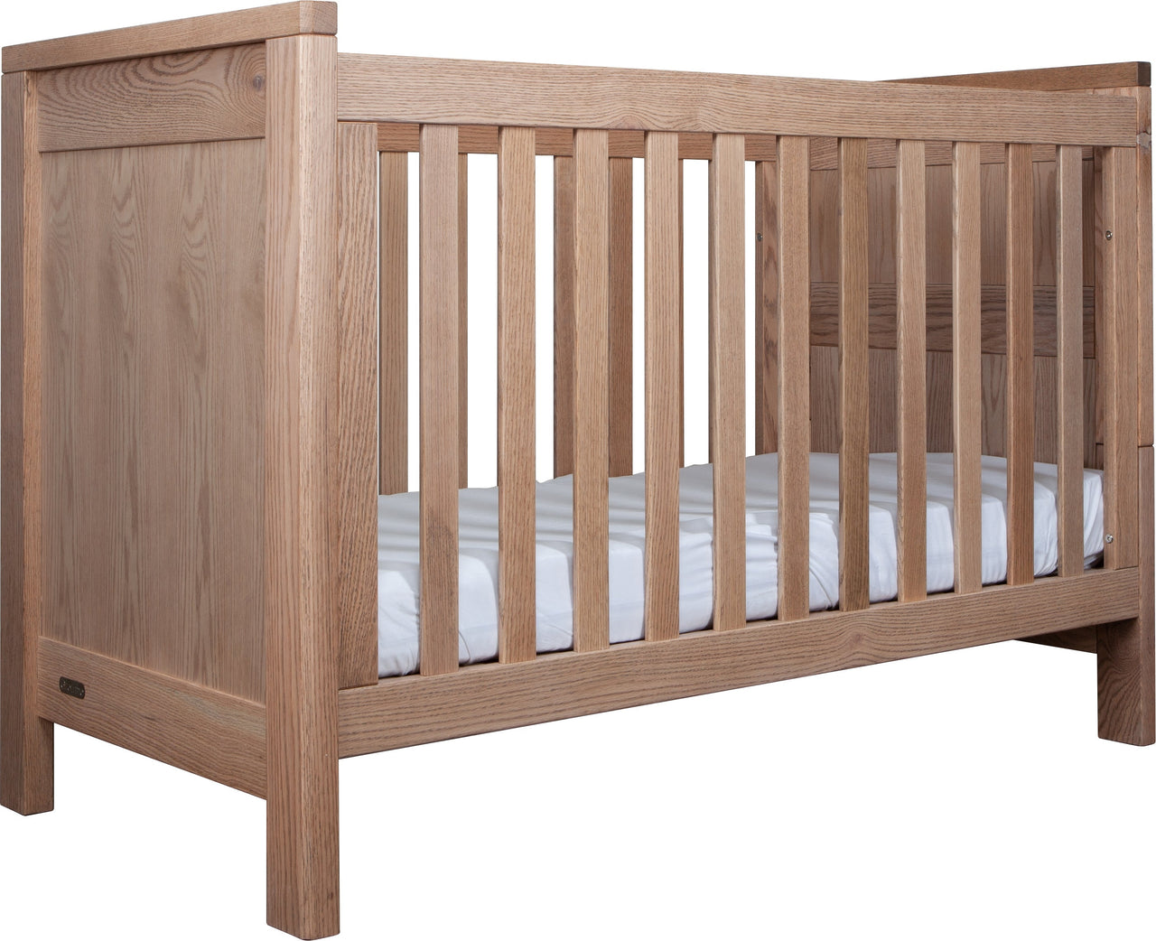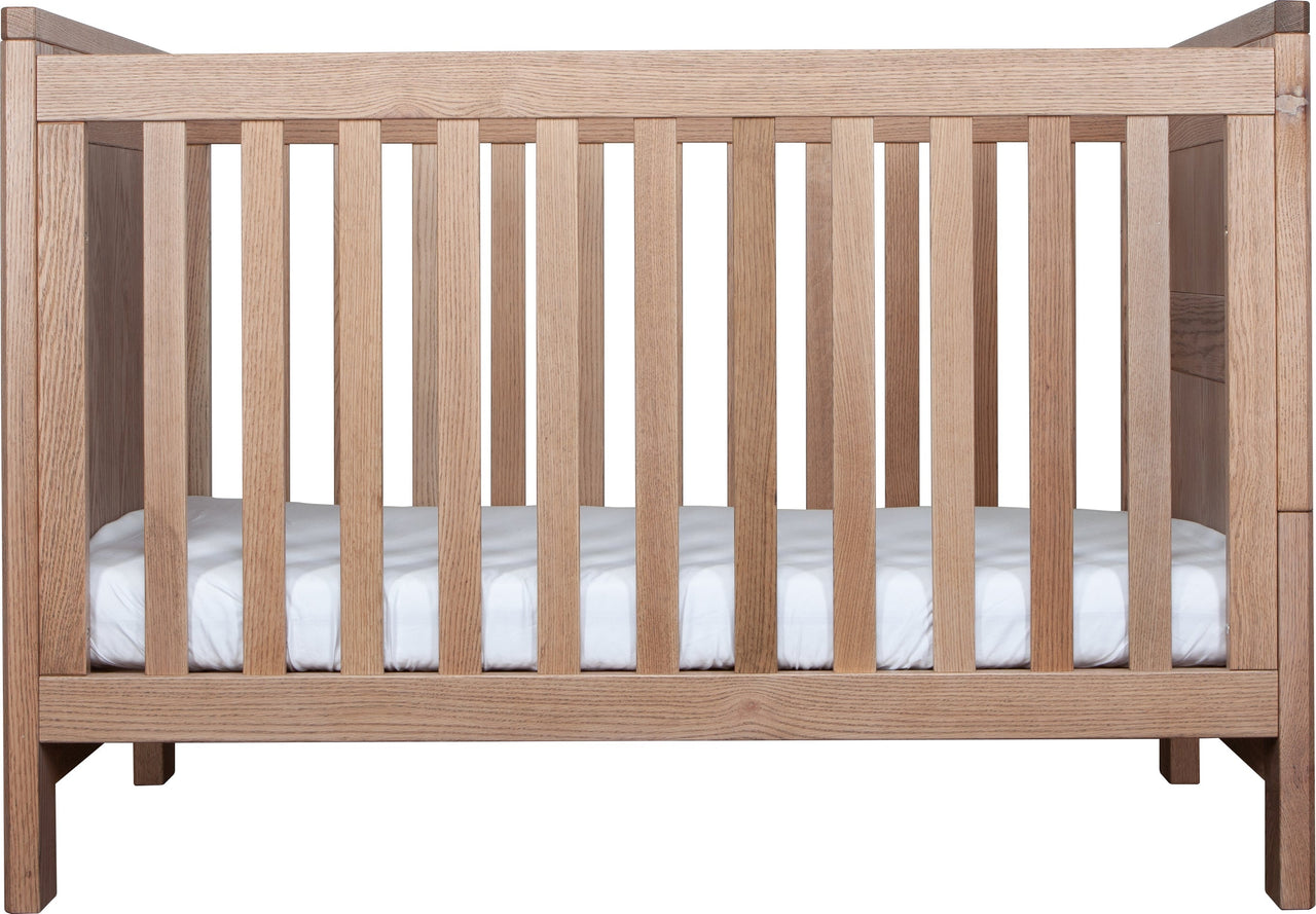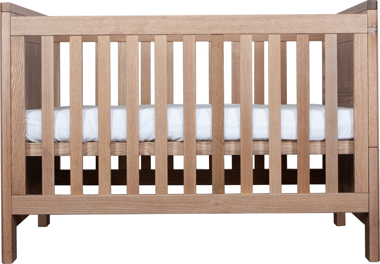 The Asher Cot is available in American Oak and brings nature into any nursery with the strong American Oak Timber panelling.
